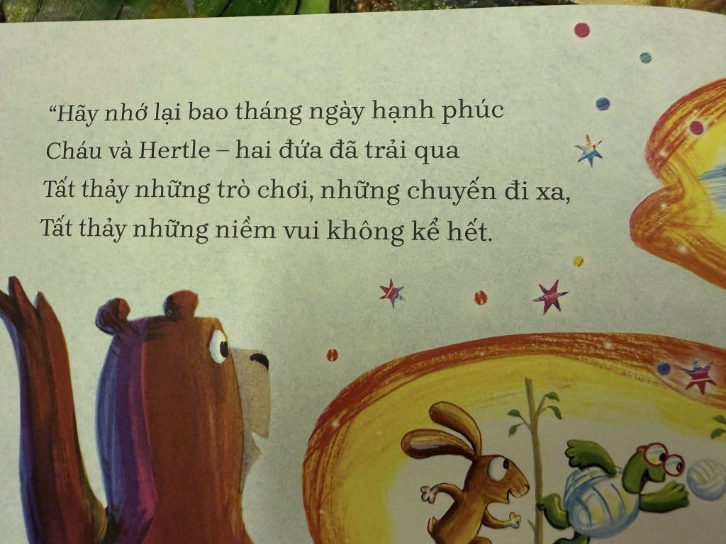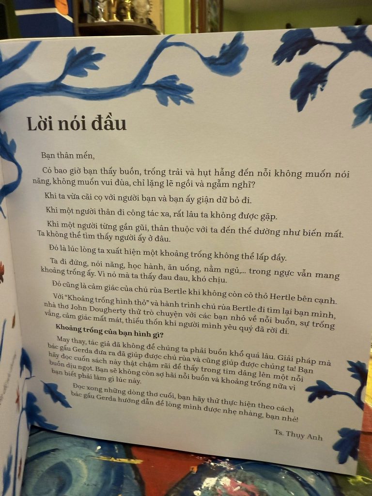 May thay, tác giả đã không để chúng ta phải buồn khổ quá lâu. Giải pháp mà bác gấu Gerda đưa ra đã giúp được chú rùa và cũng giúp được chúng ta! Bạn hãy đọc cuốn sách này thật chậm rãi để thấy trong tim dâng lên một nỗi buồn dịu ngọt. Bạn sẽ không còn sợ hãi nỗi buồn và khoảng trống nữa vì bạn biết phải làm gì lúc này.